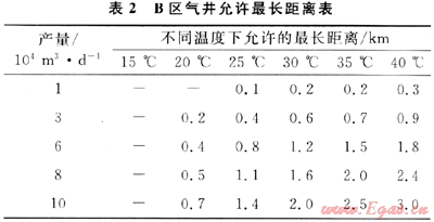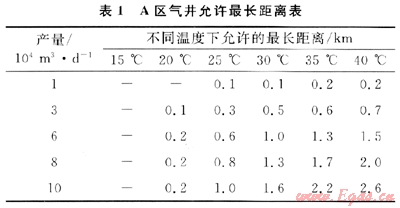 1) A區氣井的天然氣不伴熱直接進站,不加熱直接脫水,可以取消采氣管道伴熱和站內加熱工藝。不同產氣量和井口溫度允許采氣管道距離不同,其允許最長距離見表1。