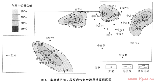 綜合考慮上述影響因素,繪制的長7段頁巖氣測全烴異常高值區圖顯示(圖5)