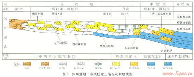 龍王廟期從盆地的西部到奉節—石柱—三匯—古藺一線發育內緩坡相。盆地內陸源物質含量少,僅在盆地西部和西北部有少量沉積,發育潮坪亞相,主要巖性為紫紅色、褐灰色、灰色泥巖、砂巖,深灰色泥質云巖、泥質泥晶云巖,沉積動力以潮汐的作用為主,能量一般不強;川東凹陷區,屬于內緩坡的低洼地帶,因受兩側隆起區阻擋作用,水體循環不暢,以靜水沉積為主,鹽度略高,局部地區甚至出現咸化和蒸發作用,巖性以灰色、深灰色泥粉晶云巖、含泥質條帶泥晶云巖為主,部分地區發育膏巖、鹽巖(如臨7井);川中川西寬緩隆起區,是內緩坡顆粒灘發育的主要地區。隆起區地形相對較高,在波浪、潮汐的作用下,水體能量較強的位置發育顆粒灘,巖性以灰色、深灰色亮晶砂屑云巖、殘余砂屑云巖、殘余礫屑云巖,以及細晶云巖為主,見少量鮞粒云巖及生屑云巖,交錯層理發育,為顆粒灘亞相;在整個隆起區,顆粒灘亞相與灘間海亞相具體發育區域很難加以區分,在橫向上多表現為灘間海發育于顆粒灘之間,縱向上夾于大套顆粒灘之間。灘間海亞相水體環境相對安靜,以細粒沉積為主,由生物擾動泥晶云巖、含不規則泥質紋層泥晶云巖和扁條狀泥晶云巖組成,發育條帶狀構造、生物擾動斑、生物潛穴構造等是該亞相的典型特點。
