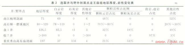 從選取的井并結合野外剖面點的巖性組合、變化情況等可以看出(表2),除去臨7井為膏鹽沉積外,龍王廟組沉積自西向東隨著水深的變化,整體厚度變大,顆粒灘沉積厚度也變大,沉積巖性的變化是由全部的白云巖沉積到開始出現石灰巖沉積,最后到石灰巖占整個龍王廟組的大部分,只有上部存在少量的白云巖的一個漸變過程。高石梯 磨溪地區是白云巖灘最發育的地區,秀山高東廟剖面代表的中緩坡區域沉積的灘體多為石灰巖灘。