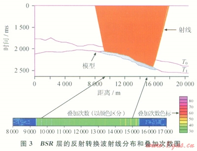 通過目標體的二維地震剖面,按HF-OBS分布間距,通過射線追蹤模擬,分析縱、橫波接收情況,根據覆蓋次數與均勻程度,選取最佳的覆蓋效果(圖3)。圖中藍色表示水合物目標體(剖面),射線所指的紅色區域表示所對應的反射轉換波射線分布區域。通過對HF-OBS分布間距為100m、200m、300m、400m、500m、600m、700m和1000m等情況下模擬得到的幾組數據的分析比較,分別計算落入不同距離的線段內的疊加次數,并用色標進行表示,然后分析疊加次數的均勻程度和覆蓋效果。當HF-OBS分布間距在500m以下時(300~400m效果最佳),線段內的疊加次數達超過30次,并且疊加次數的分布比較均勻。最后,確定HF-OBS臺站間距小于500m時效果較好,且分布間距愈小,所使用的HF-OBS臺數愈多,疊加次數愈高,覆蓋效果愈好。