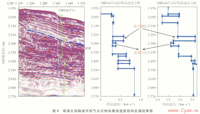 盡管橫波的整體成像效果尚無法與縱波相比,但其走時信息可用于縱橫波速度聯合反演以獲得HF-OBS所在位置較可靠的縱波和橫波速度,進而進行定量分析并確定水合物存在與否。圖8為HF-OBShl7站位的速度反演結果。縱橫波速度在BSR上部明顯增大,縱波速度值介于1788~2742m/s,增幅為420~1090m/s;橫波速度介于400~600m/s,增幅為200~260m/s,反映水合物礦體的存在。淺部的縱波速度急劇下降而橫波幾乎沒有變化,表明此處存在淺部游離氣或游離氣運移通道。從圖8可以看出,HF-OBS反演速度的垂向分辨率比傳統的速度譜分辨率有了很大的提高,充分揭示了天然氣水合物的縱、橫波速度結構,并且速度結構異常與BSR及水合物礦體的分布層位有很好的對應關系[18],從而增強了對水合物礦體的分辨能力。