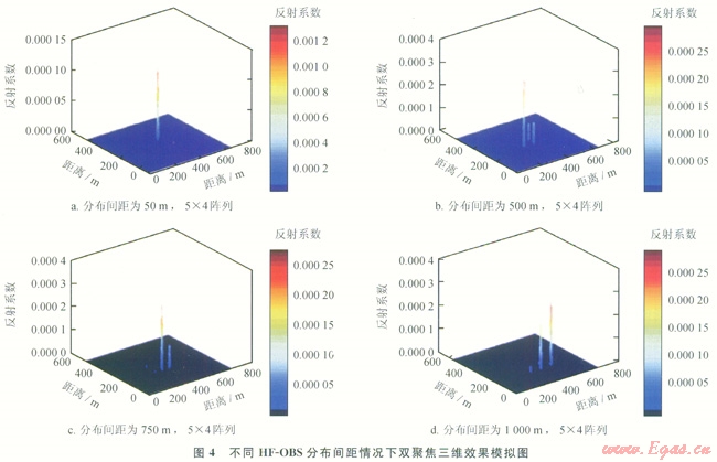 圖4為聚焦模擬效果圖。當HF-OBS分布間距為500m時,出現明顯旁瓣,但模擬震源的位置并未發牛變化(圖4-b);當分布間距為750m時,模擬震源的位置發生變化,成像效果明顯變差(圖4-c);當分布間距變小時,模擬成像效果愈來愈好(圖4-a)。
