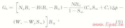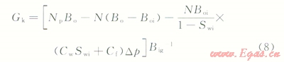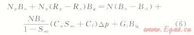 2)地面的累積產氣量為Gp,Gp=NpRp,Rp為累積生產氣油比。而在p壓力下累積產油量Np的溶解氣量為NpRs,Rs為p壓力下的溶解氣油比。因此,地層壓力由pi下降到p時,由油藏中多產出的天然氣地下體積量為Np(Rp-Rs)Bg,Bg為p壓力下的天然氣體積系數。