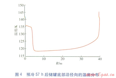 點(0,0)處的溫度隨預冷時間的變化見圖3,預冷57h后儲罐底部沿徑向的溫度分布見圖4。從圖3可以看出,儲罐底部中心(即點(0,0)處)的溫度并不是隨著預冷過程的進行而一直降低的,當儲罐底部溫度降低到一定程度后,底部中心出現了溫度不降反升的現象。從圖4也可以看出,底部中心區域的溫度高于其他位置(除靠近側壁處)。這是因為噴淋的液滴到達儲罐底面后,在底面氣化,產生的氣體無法及時沿底面向四周擴散,積聚在儲罐底部的中心區域,形成二次回流,二次回流阻礙了儲罐底面與內部低溫氣體的對流換熱。同時,底部的混凝土向內部的導熱還在繼續,因此在二次回流區出現了溫度不降反升的現象。隨著預冷的繼續,底部混凝土的熱量充分釋放,液滴在儲罐底面處的氣化量減小,產生的新氣體量減少,二次回流區逐漸被壓縮,底部中心區域的溫度又重新下降。