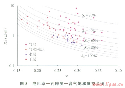 式(6)、(7)分別為孔隙結(jié)構(gòu)指數(shù)(m)和飽和度指數(shù)(n)的計算公式,利用修正的阿爾奇公式計算Sw,并建立電阻率孔隙度 含氣飽和度交會圖,能夠較好地識別氣水層(圖5)。