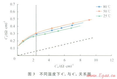 圖3中虛斜線為純水砂巖在25℃實驗條件下的關(guān)系曲線,從圖3中可以看出,在淡的平衡溶液部分(Cw在0~2.5之間),泥質(zhì)砂巖的電導(dǎo)率(Co)將隨溶液電導(dǎo)率(Cw)的增加急劇增大,Co增加的速度遠(yuǎn)大于Cw增加的速度,當(dāng)溶液電導(dǎo)率(Cw)進一步增加的時候,泥質(zhì)砂巖的電導(dǎo)率(Co)將隨溶液電導(dǎo)率(Cw)的增加呈線性增加,即當(dāng)溶液電導(dǎo)率(Cw)大于2.5(W·cm)-1時,此時Co—Cw的曲線呈線性關(guān)系。根據(jù)W&S模型,在常溫(25℃)下,當(dāng)溶液礦化度超過一定濃度時,陽離子附加電導(dǎo)B值將趨于一個非常有限的極值。礦化度越高,水溶液電導(dǎo)率(Cw)就越大,附加電導(dǎo)分量(BQv)與溶液電導(dǎo)(Cw)相比對總的電導(dǎo)貢獻就越小。因此當(dāng)?shù)貙铀V化度很高時,黏土附加電導(dǎo)作用是完全可以忽略的。