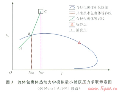 目前古流體壓力值測定方法有多種[8-18],筆者結合本地區油氣成藏的地質條件,采用流體包裹體PVT模擬法來計算古流體壓力值。如圖3中,ABC線為烴類包裹體或含烴鹽水包裹體等容線,AB段為氣液兩相共存,到B點均一為液相;ThB為含烴鹽水或烴類流體包裹體均一溫度,ThC為同期鹽水包裹體均一溫度。