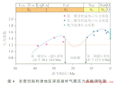 利津地區凝析氣藏古壓力系數隨時間演化的關系表明(圖4):