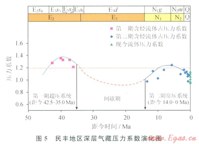 民豐地區深層氣藏(包括凝析氣藏)古壓力系數隨時間演化的關系表明(圖5):