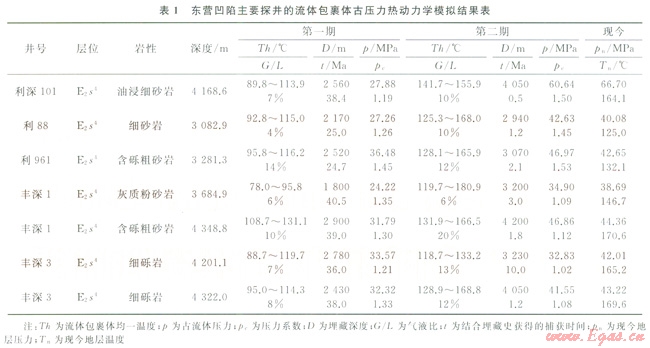 將各期次鹽水包裹體的均一溫度及其共生的同期含烴鹽水包裹體或烴類包裹體的均一溫度、氣/液比和化學組成輸入VTFLINC軟件,即可獲得熱動力學模擬結果——各期次流體包裹體的最小捕獲壓力和壓力系數。利用東營凹陷北帶利津、民豐等地區所采集樣品獲得“數據對”的樣品開展了熱動力學模擬,模擬得到了主要探井的部分古流體壓力(表1)。