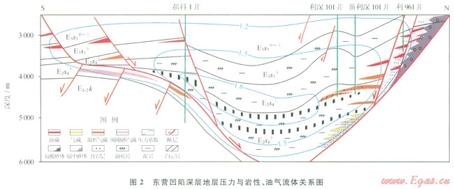 東營凹陷是中國東部富油氣凹陷之一,含油氣豐度高,探明儲量大,目前已發現的油氣主要分布于埋深小于3500m的地層。隨著近期深層勘探的不斷深入,在東營凹陷北部陡坡帶的民豐、利津等地區發現了凝析氣藏和氣藏,實現了深層勘探的重大突破,展示了深層較好的油氣勘探前景。但是,油氣藏的地質條件和流體壓力存在較大的差異,在古近紀的構造演化過程中,兩地區存在沉降中心的轉換,導致沉積作用、生烴作用和油氣富集發生較大的變化,直接表現出深層凝析氣藏和氣藏的地層壓力既有常壓,也有超壓。