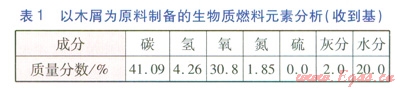 以木屑為原料制備的生物質燃料元素分析(收到基)見表l。生物質燃料的低位發熱量為14.46MJ/kg。