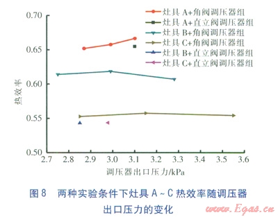 以直立閥鋼瓶作為氣源的實驗方法為:選取鋼瓶內壓為0.03MPa,進行灶具熱效率實驗。待灶具燃燒穩定后,將盛裝一定水的鋁鍋放于灶具上,待水溫升至高于初始溫度5℃時,開始攪拌,并計量燃氣耗量。待水溫比初始溫度高30℃時,關閉灶具。實驗數據經過計算,可以得到灶具的熱效率[3]。以角閥鋼瓶作為氣源的實驗方法為:在LPG鋼瓶滿瓶條件下,分別將調壓器調至最大壓力(對應調壓器最大刻度)、中間壓力、最小壓力(對應調壓器最小刻度)進行實驗,實驗方法與以直立閥鋼瓶作為氣源的實驗方法相同。兩種實驗條件下灶具A~C熱效率隨調壓器出口壓力的變化見圖8。