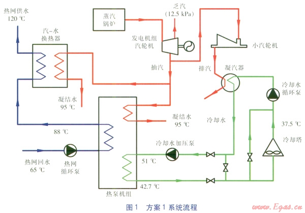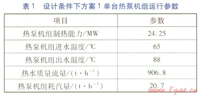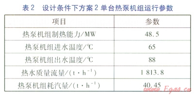 對于方案1,熱泵機組回收利用小汽輪機凝汽器冷卻水余熱,由于冷卻水可較遠距離輸送,因此熱泵機房選址靈活。