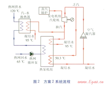 發電機組汽輪機抽汽作為熱泵機組驅動蒸汽,低溫熱源為小汽輪機凝汽器冷卻水余熱。方案1的系統流程見圖1。系統流程可分為3個分項流程:a.熱網循環水流程:熱網回水65℃,經熱泵機組加熱至88℃后,進入汽—水換熱器加熱至l20℃作為熱網供水。b.發電機組汽輪機抽汽流程:不考慮小汽輪機用汽,發電機組汽輪機抽汽分為兩部分,一部分作為熱泵機組驅動蒸汽,另一部分進入汽—水換熱器加熱熱網回水,兩部分凝結水溫度均為95℃,并由汽動給水泵加壓輸送回蒸汽鍋爐。c.凝汽器冷卻水流程:小汽輪機凝汽器出口冷卻水溫度為51℃,作為熱泵機組低溫熱源,余熱利用后溫度降至42.7℃,經冷卻塔進一步降溫后(冷卻塔出水溫度為37.5℃)進入凝汽器。