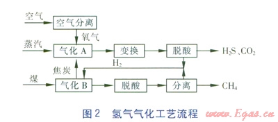 直接轉化方法主要有氫氣氣化、水蒸氣催化氣化方法。氫氣氣化方法以氫氣作為氣化劑,氫氣由焦炭—蒸汽—氧氣氣化制得(對應氣化器A一路),煤氫氣氣化后(對應氣化器B一路)經脫酸得到的產物主要為甲烷、氫氣(過剩部分),經分離最終得到甲烷,過剩氫氣與來自氣化器A一路的氫氣一起返回氣化器B作為煤氣化劑。氫氣氣化工藝流程見圖2。目前,l3本新能源產業技術綜合開發機構(NEDO)正大力發展該項技術,據報道氫氣氣化技術的熱效率比間接轉化方法高,造價也有望降低,從而進一步提高SNG的競爭力[2]。