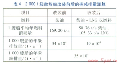 根據(jù)國(guó)家發(fā)改委提供的能源碳排放量計(jì)算方法,LNG與燃油的碳排放強(qiáng)度系數(shù)分別為0.27和3.18,即每消耗1kg LNG產(chǎn)生0.27kg的CO2,每消耗1kg燃油產(chǎn)生3.18kg的CO2,據(jù)此對(duì)2000t級(jí)散貨船改裝前后的碳減排量進(jìn)行測(cè)算比較,見(jiàn)表4。