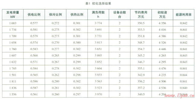 以10萬m2酒店建筑為例,采用分布式能源系統優化計算軟件,綜合考慮能源利用效率、節約運行費用、初投資、機組滿負荷時數等因素后,得到的不同發電容量下的方案排序如表1所示。