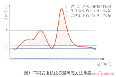 按照以上方法確定的發電機容量一般介于單純按照以熱定電和以電定熱確定的發電容量之間,如圖1所示。