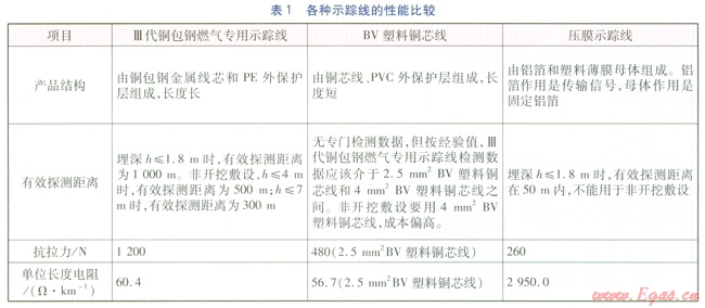 ①摒棄壓膜示蹤線之后,目前較多選用BV塑料銅芯線作為示蹤線代用產(chǎn)品,但因其是非專業(yè)產(chǎn)品,存在成本高、抗腐蝕和抗老化性能差、抗拉力有局限性、長度短致使接頭增多等缺陷。筆者建議可改用Ⅲ代銅包鋼燃?xì)鈱S檬聚櫨€,兇其具有電阻小、抗拉強度高、抗腐蝕和抗老化性能好、長度長可減少接頭、連接處有專用連接防護接頭等優(yōu)勢,可滿足水平定向鉆敷設(shè)PE燃?xì)夤艿缹κ聚櫨€的要求。根據(jù)中山順康塑料制品公司提供的數(shù)據(jù),對幾種示 蹤線進(jìn)行性能比較,見表1。