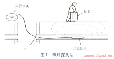 示蹤探頭法(見圖l)主要用于探查有出入口的非金屬管道。該方法是將能發(fā)射電磁信號的示蹤探頭通過穿管設(shè)備,從管道開口處穿入拉管管道內(nèi),在地面上用接收機接收示蹤探頭發(fā)射的信號,對拉管管道進(jìn)行準(zhǔn)確定位[5]。只要具備良好的接地條件,此方法就能有效避免常規(guī)示蹤線法探測存在的弊端,不易受周邊管線、介質(zhì)干擾,能較大程度保證拉管管道的探測精度。采用該方法具有探測結(jié)果能準(zhǔn)確提供拉管管道的三維空間位置數(shù)據(jù)及探測數(shù)據(jù)可作為拉管管道施工驗收依據(jù)兩點意義。