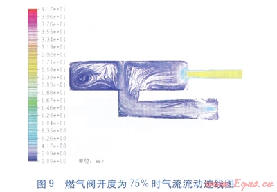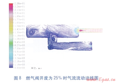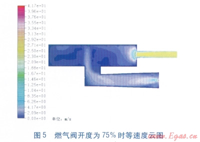 利用FLUENT軟件對比模擬了燃?xì)忾y開度為25%和75%兩種條件下爐腔內(nèi)的氣體流動(dòng)狀態(tài)。計(jì)算得出兩種狀態(tài)下整個(gè)爐腔內(nèi)氣流的最高流速分別為24.61m/s和46.86m/s。高速流主要出現(xiàn)在爐腔排氣導(dǎo)管。