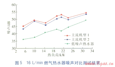 由圖5可知,當熱負荷在24kW以下時,l6L/min的低噪聲熱水器的噪聲比主流機型低10dB以上;最大熱負荷時,低4dB以上。
