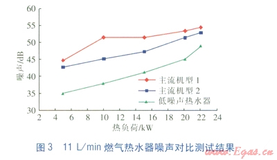 由圖3可知,當熱負荷在18kW以下時,11L/min的低噪聲熱水器的噪聲比主流機型低7dB以上;最大熱負荷時,低4dB以上。