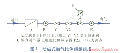 動磁式燃氣比例閥組(適用于大氣式燃燒方式)組成見圖l,由兩級安全截止閥、動磁式燃氣比例閥(由電磁比例調節器、壓力調節器構成,以下簡稱比例閥)組成。當燃氣進入閥組時,先經過濾器、兩級安全截止閥,再進入比例閥。比例閥前后設有進出l5壓力測點。