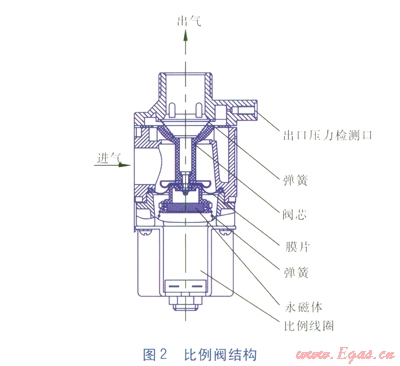 比例閥還具有穩定燃氣壓力作用,當作用在壓力調節器膜片上的燃氣壓力增大時,膜片帶動閥芯向下運動減小相對開度,保證出口壓力的穩定;反之,當作用在壓力調節器膜片上的燃氣壓力減小時,膜片帶動閥芯向上運動增大相對開度,保證出口壓力的穩定。