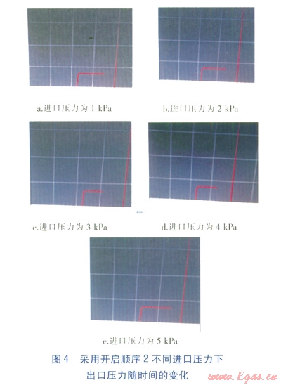 在不同進氣壓力p1(1、2、3、4、5kPa)下進行試驗,并記錄出口壓力p2的變化情況,見圖4,橫坐標表示時間,縱坐標表示p2。由圖4可知,采用開啟順序2時,出口壓力p2比較穩定,隨著進口壓力p1升高,出口壓力p2仍然比較穩定,沒有出現過沖現象。