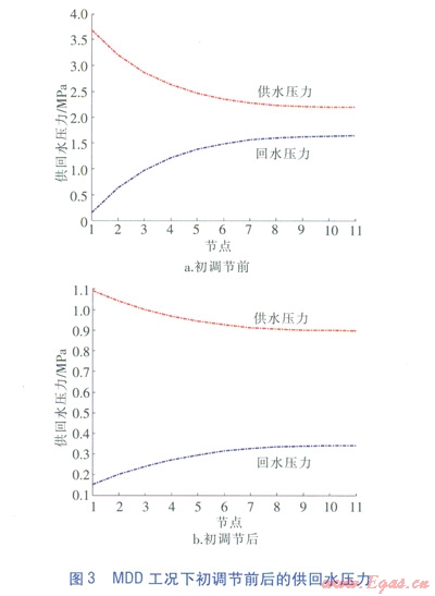 管網采用末端定壓差的方式,定壓差為556.96kPa。初調節前近端用戶資用壓頭約為3550kPa,是末端用戶資用壓頭的7倍。MDD工況初調節前后的供回水壓力見圖3。