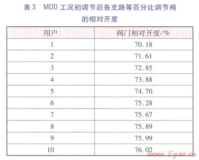 MDD工況初調節前各支路的流量見表2。MDD工況下,初調節前管網總流量為3113m3/h.遠遠超出設計流量(1000m3/h),近端用戶的水力失調度為4.97,出現嚴重的水力失調,這樣長時間運行下去,不僅管網壓力很高,而且水泵超負荷運行,造成能源的極大浪費。