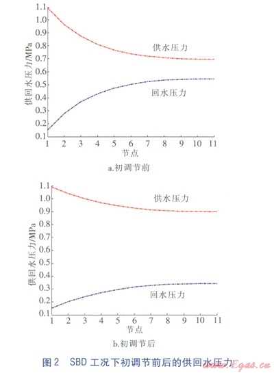 通過計算整個管網最不利熱用戶的壓力降,選擇水泵的壓頭為938.99kPa。利用Matlab軟件編程實現整個管網的運行調節。SBD工況下初調節前、后的供回水壓力見圖2。