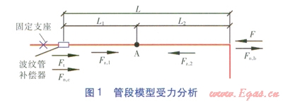 本文分析對象為一側活動端為補償彎頭,另一側活動端為波紋管補償器的直埋水平轉角管段,設定管段中存在不發生位移的點A,管段模型受力分析見圖1。