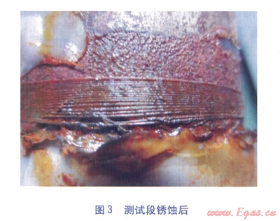 在電化學(xué)加速銹蝕的情況下,試件經(jīng)過(guò)2d持續(xù)腐蝕后,布里淵分析儀基本監(jiān)測(cè)不到應(yīng)變的變化,此時(shí)停止試驗(yàn)。測(cè)試段銹蝕前后的情況分別見(jiàn)圖2、3。