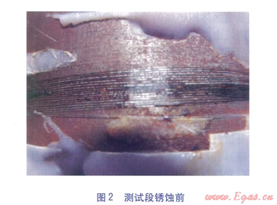 試件為一段長(zhǎng)度為200mm的鋼管(材質(zhì)為Q235),對(duì)銹蝕測(cè)試段外壁進(jìn)行拋光處理,拋光后測(cè)試段外直徑為73.8mm,壁厚為3.5m。試件中光纖的布置方式見(jiàn)圖l。在距鋼管端面50mm處纏繞光纖層(傳感段),纏繞時(shí)使光纖帶有一定的預(yù)應(yīng)力,保證光纖與鋼管表面緊密接觸,纏繞的光纖總長(zhǎng)度在4m左右。將光纖用環(huán)氧樹(shù)脂膠固定在鋼管上,傳感段的引出端與帶保護(hù)套的傳輸光纜熔接,將熔接處進(jìn)行保護(hù)處理,并在鋼管兩端的引出位置用環(huán)氧樹(shù)脂膠進(jìn)行固定。光纖設(shè)置完畢后,在鋼管與PE保護(hù)管間進(jìn)行發(fā)泡處理。