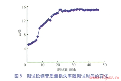 由測(cè)試結(jié)果可知,發(fā)生銹蝕前測(cè)試段外直徑D1為73.8mm,電化學(xué)加速銹蝕結(jié)束后測(cè)試段鋼管不包含銹蝕層的外直徑D1為72.8mm,代入式(2)可計(jì)算得到電化學(xué)加速銹蝕結(jié)束后測(cè)試段鋼管質(zhì)量損失率e為0.149,此時(shí)傳感段光纖的應(yīng)變?yōu)?span lang="EN-US">2161.0×10-6。由式(7)可計(jì)算得到,由銹蝕導(dǎo)致的測(cè)試段體積膨脹率h為l.16。設(shè)定在鋼管發(fā)生銹蝕后h保持不變,則可由布里淵分析儀讀取的傳感段光纖應(yīng)變及式(7)計(jì)算得到各時(shí)刻測(cè)試段鋼管質(zhì)量損失率。測(cè)試段鋼管質(zhì)量損失率隨測(cè)試時(shí)間的變化見(jiàn)圖5。