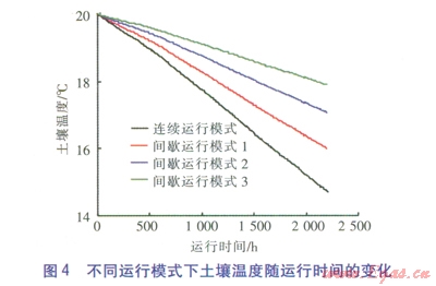 不同運行模式下土壤溫度隨運行時間的變化見圖4。由圖4可知,熱泵機組運行時土壤溫度逐漸下降,下降幅度與地埋管換熱器的運行模式有關。連續運行模式下,到供暖末期,土壤溫度由初期的20℃降為14.72℃,降幅達5.28℃。間歇運行模式1下,到供暖末期,土壤溫度為16.01℃,降幅為3.99℃。間歇運行模式2下,到供暖末期,土壤溫度為l7.08℃,降幅為2.92℃。間歇運行模式3下,到供暖末期,土壤溫度為17.91℃,降幅為2.09℃。由以上分析可知,當日開停比減小時,地埋管換熱器運行時間減少,從土壤提取的熱量減少,土壤溫度下降幅度減小。但由于每天的恢復時間較短,不足以使土壤溫度有明顯的改變。