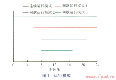 對于地埋管換熱器間歇運行模式,將每日的運行時間與非運行時間之比定義為日開停比。為了比較連續運行與間歇運行模式以及不同日開停比的間歇運行模式下熱泵機組的性能,選取連續運行模式和3種間歇運行模式進行對比分析,各運行模式見圖1。間歇運行模式1的日開停比為l8:6,間歇運行模式2為13:11,間歇運行模式3為9-15。模型不考慮地埋管換熱器間歇運行對空調房間供暖的影響,認為地埋管換熱器停用時段由太陽能熱水系統或其他低溫熱源替代土壤源。