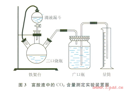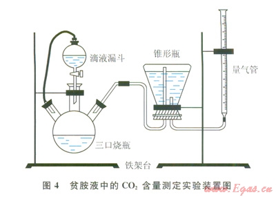 圖3、4分別為富胺液、貧胺液中的CO2含量檢測(cè)裝置,胺液樣品中CO2含量使用酸解法測(cè)得坫]。酸解法主要利用強(qiáng)酸置換弱酸的原理,用強(qiáng)酸H2SO4將CO2從胺液中置換出來(lái),通過測(cè)定放出的CO2氣體體積計(jì)算溶液對(duì)CO2的吸收量。