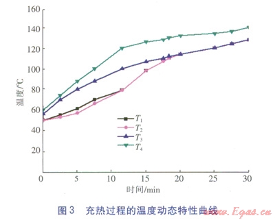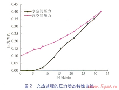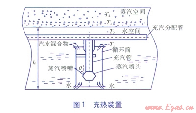 蒸汽蓄熱器是利用水的單位體積焓遠(yuǎn)大于蒸汽的特性而設(shè)計(jì)的間接存儲(chǔ)蒸汽的貯熱裝置,其中的水既是蒸汽和水進(jìn)行熱交換的傳熱介質(zhì),又是蓄存熱能的載熱體[1]。蒸汽蓄熱器的蓄熱(充熱)過(guò)程是鍋爐供給的高壓蒸汽直接與蒸汽壓較低的飽和水的混合傳熱過(guò)程。充熱裝置是蒸汽蓄熱器的一部分,見(jiàn)圖l。充熱過(guò)程中,工作蒸汽通過(guò)充汽分配管進(jìn)入蒸汽噴射系統(tǒng),均勻噴射入蓄熱器水空間,使蓄熱器內(nèi)水溫、水位和焓逐漸升高。充熱過(guò)程終止時(shí),蓄熱器內(nèi)儲(chǔ)存與充汽分配管等蒸汽壓的飽和水及與其相應(yīng)的焓,同時(shí)水位達(dá)到與充汽分配管底部平齊[4]。充熱過(guò)程要力求高壓蒸汽通過(guò)噴嘴盡量充分、快速、均勻地溶入到飽和水中,這要求盡量強(qiáng)化水循環(huán)的湍流擾動(dòng)。傳質(zhì)傳熱的程度和速度直接影響飽和水空間溫度場(chǎng)及蒸汽壓力與水飽和蒸汽壓之間的偏差,由此造成不可逆內(nèi)部熱損失隨充熱時(shí)間的增加而增加。充熱過(guò)程動(dòng)態(tài)特性曲線(xiàn)見(jiàn)圖2、3。