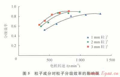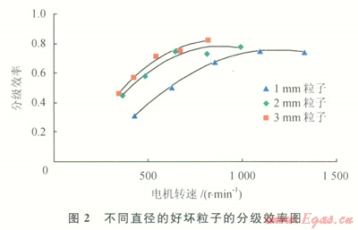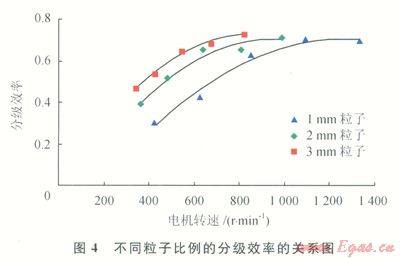 實驗材料仍為直徑分別為1mm、2mm、3mm的好壞粒子的混合物,但好壞粒子混合比例變?yōu)?span lang="EN-US">1:1(體積比),得到分級效率和電機轉(zhuǎn)速之間的關系(圖4)。
