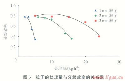 從圖3中可以看出,對于某一直徑的鋼粒子混合物,隨著粒子處理量的增加,分級效率呈現(xiàn)下降趨勢;鋼粒子的直徑越小,其分級效率受處理量的影響越大。分析得出,出現(xiàn)該種情況的原因是大直徑完整粒子與破損粒子的質(zhì)量差異較大,小直徑完整粒子與破損粒子的質(zhì)量差異較小,該分離機分離好壞粒子的機理在于質(zhì)量的差異,因此也就出現(xiàn)了分選裝置處理粒子的能力和鋼粒子直徑相關的現(xiàn)象。