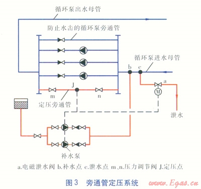 當熱源與熱用戶之間高差較大時,往往采用旁通管定壓方式,以適當降低管網運行壓力[1],定壓旁通管管徑的計算方法見文獻[2]。定壓旁通管與防止水擊的循環泵旁通管雖然位置均位于循環泵進出口之間,但作用不同,不能互相代替。旁通管定壓系統見圖3。旁通管定壓方式的優勢在于通過調節壓力調節閥可使得供回水壓線在原有基礎上整體下移,有利于熱網安全運行[1,3]。