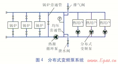 隨著我國供熱行業節能意識的不斷增強,分布式變頻泵系統在供熱領域的應用越來越廣泛。分布式變頻泵系統的熱源循環泵只需要克服熱源內部阻力,大大減小了熱源循環泵的能耗。分布式變頻泵承擔熱用戶(熱力站)的流量,克服熱用戶及管網阻力。與傳統動力集中式系統相比,降低了近端熱用戶節流富裕壓頭造成的能量損失。因此,理論上分布式變頻泵系統沒有多余的能耗,比傳統動力集中式系統節能。分布式變頻泵系統見圖4。