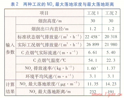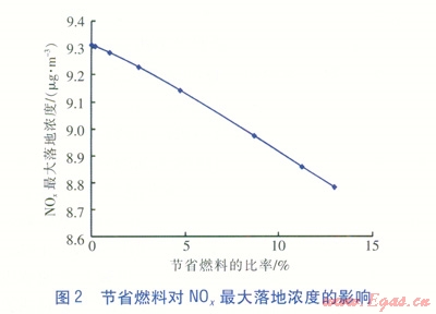 綜合分析正負(fù)兩方面因素,排煙溫度降低對(duì)NOx最大落地濃度的影響要比燃料的節(jié)省對(duì)NOx最大落地濃度的影響更為顯著,說明排煙溫度降低是主要影響因素,綜合起來NOx最大落地濃度是隨著煙氣溫度的降低逐漸增大的。