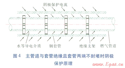 ③不可避免加設套管時,套管兩端可不必密封防水材料,只要在主管道與套管之間充填柔軟材料防止沙石進入對防腐層起破壞作用即可。因為當套管內有水或泥土存在時,能起到導電介質的作用,陰極保護電流通過介質形成回路,不會被屏蔽。套管可視為土壤介質的一部分,陰極保護電流從套管外壁流入,從套管內壁流出,再從主管道外部流入,主管道將受到很好的陰極保護[2]。如果套管與主管道間有特定性能的電解質物質,導電性能會更好,主管道陰極保護的效果會更好,其原理見圖4。