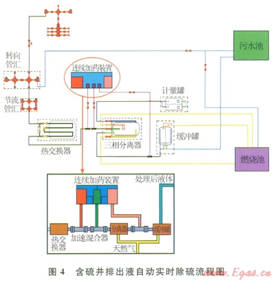 含硫井排出液自動實時處理技術(shù)主要采用物理和化學(xué)相結(jié)合的方法,對高含硫氣井測試期間排出液進行除硫、消泡和殘酸中和處理。該技術(shù)主要通過分離器、緩沖罐對流體中的氣體進行一級和二級物理分離,同時采用自動實時除硫裝置在流程中特定位置加注處理劑對產(chǎn)出流體進行化學(xué)處理,除硫劑等的優(yōu)選至關(guān)重要[13]。自動實時除硫裝置是該工藝技術(shù)得以成功實現(xiàn)的關(guān)鍵,其主要由注入系統(tǒng)、混合系統(tǒng)和監(jiān)測與控制系統(tǒng)組成,作業(yè)中通過實時監(jiān)測放噴出口大氣中H2S含量與污水池殘酸濃度,并及時反饋數(shù)據(jù)給自動實時除硫裝置PLC綜合控制系統(tǒng),由PLC自動控制向流程管線內(nèi)加注除硫劑、消泡劑、pH值調(diào)節(jié)劑,在密閉環(huán)境中進行除硫、消泡和殘酸中和。最終將處理后排放至污水池的流體pH值基本控制在6.4~7.8范圍,放噴出口大氣環(huán)境中H2S含量小于l4.4mg/m3,實現(xiàn)安全排放,保護現(xiàn)場作業(yè)環(huán)境。